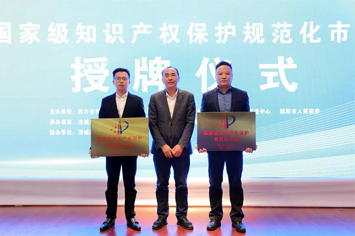 赵辉代表省市场监管局、省知识产权服务促进中心向绵阳毅德城等两家企业顺利通过国家知识产权局认定、获得“国家级知识产权保护规范化市场”的荣誉表示祝贺,并为企业授牌。他强调要加强对知识产权侵权行为的惩治力度,打造诚信市场,净化市场环境,更好助力经济社会的高质量发展。