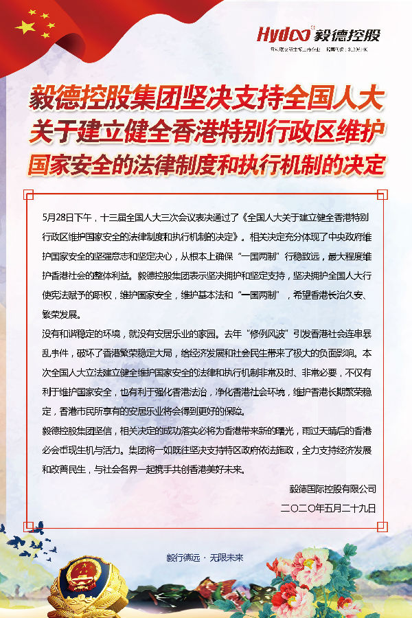 5月28日下午,十三届全国人大三次会议表决通过了《全国人大关于建立健全香港特别行政区维护国家安全的法律制度和执行机制的决定》。相关决定充分体现了中央政府维护国家安全的坚强意志和坚定决心,从根本上确保“一国两制”行稳致远,最大程度维护香港社会的整体利益。毅德控股集团表示坚决拥护和坚定支持,坚决拥护全国人大行使宪法赋予的职权,维护国家安全,维护基本法和“一国两制”,希望香港长治久安、繁荣发展。